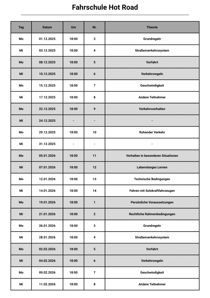 Die Theorie findet bei uns zweimal pro Woche statt, immer montags und mittwochs von 18:00 bis 19:30 Uhr.